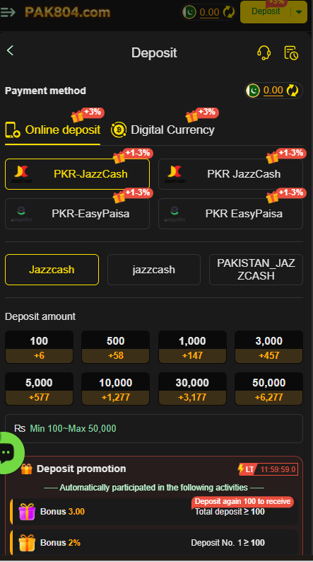 Deposits and withdrawals on PAK804 Game are simple and localized for Pakistani users. You can deposit money using JazzCash, Easypaisa, or bank transfer. Withdrawals work the same way once your winnings reach the minimum withdrawal limit, you can request a transfer to your account.