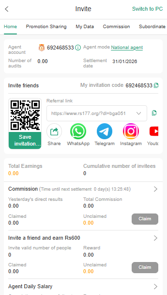 Invite friends using your referral link and earn commissions when they play and recharge.